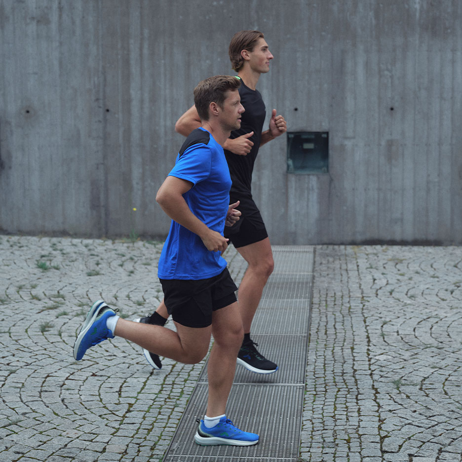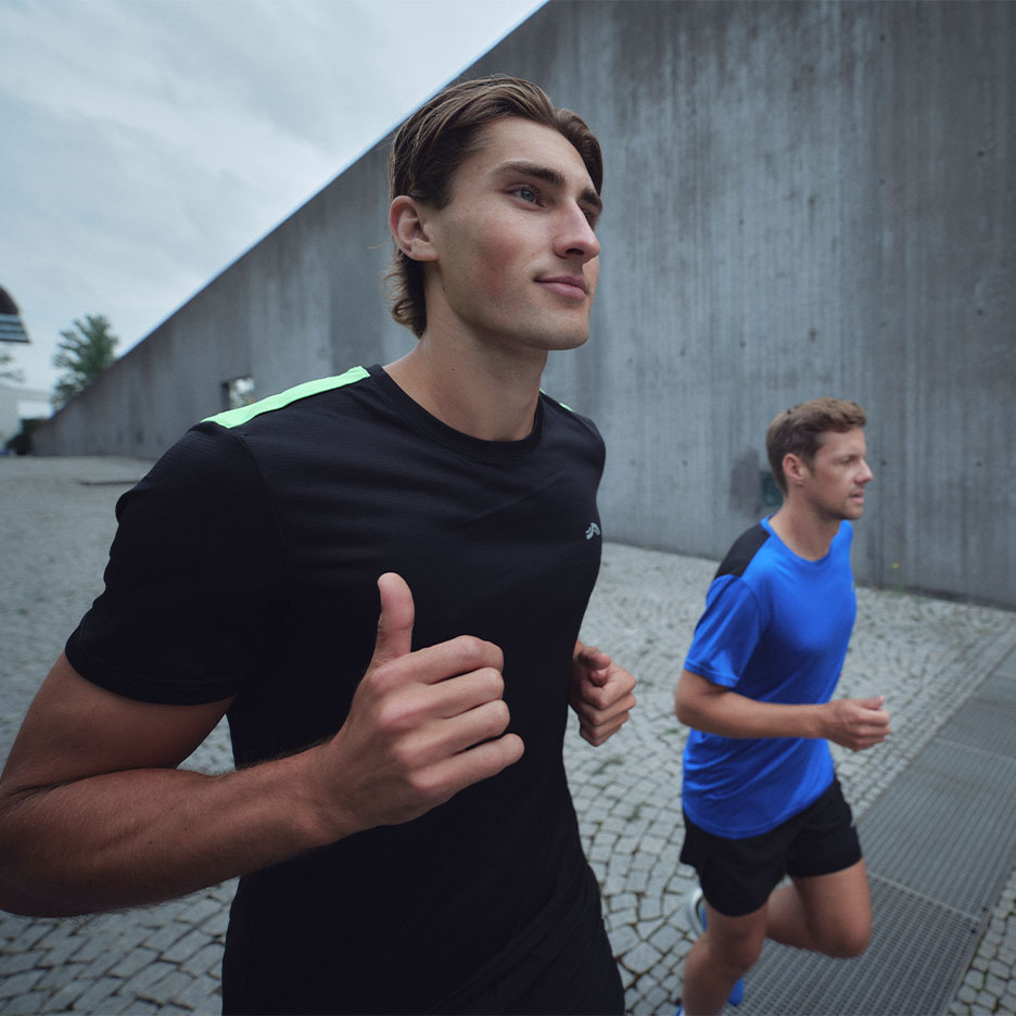 "O vestuário funcional faz toda a diferença — transporta a humidade, regula a temperatura e acompanha o teu movimento. Notas a diferença a cada quilómetro", diz o Tim, que corre quase todos os dias.
