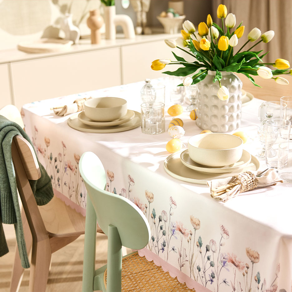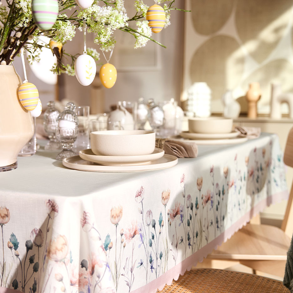 Quer estejas a organizar um brunch de Páscoa luxuoso ou a saborear um café e um bolo a dois: a tua mesa de Páscoa prepara-se praticamente sozinha. Uma toalha de mesa fresca e primaveril transforma qualquer mesa no centro perfeito para a festa. Se optares por motivos florais de campo e cores modernas, a toalha de mesa vai acompanhar-te não só durante a Páscoa, mas também ao longo de toda a primavera e verão.