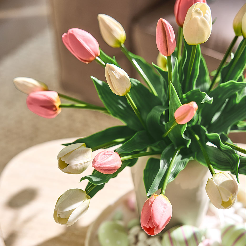 Para a decoração, não precisas de correr para a florista ou para o jardim. Um ramo de tulipas artificiais de alta qualidade é quase impossível de distinguir das verdadeiras — e mantém-se fresco para sempre. Se quiseres dar um toque pessoal ao bouquet e reforçar o espírito de Páscoa, mistura as flores com ramos de salgueiro, por exemplo, e decora tudo com pequenos ovos pendentes. Os profissionais de decoração apostam em cores harmoniosas, mas não há limites para a tua imaginação.
